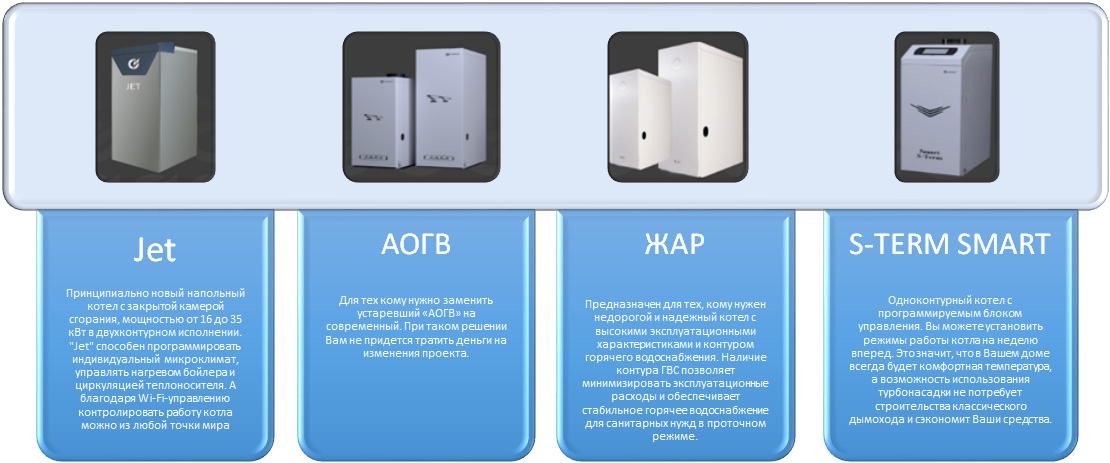 - Котлы серии "Jet". Принципиально новый напольный котел с закрытой камерой сгорания, мощностью от 16 до 35 кВт в двухконтурном исполнении. Способен программировать индивидуальный микроклимат, управлять нагревом бойлера и циркуляцией теплоносителя. А благодаря Wi-Fi-управлению контролировать работу котла можно из любой точки мира.